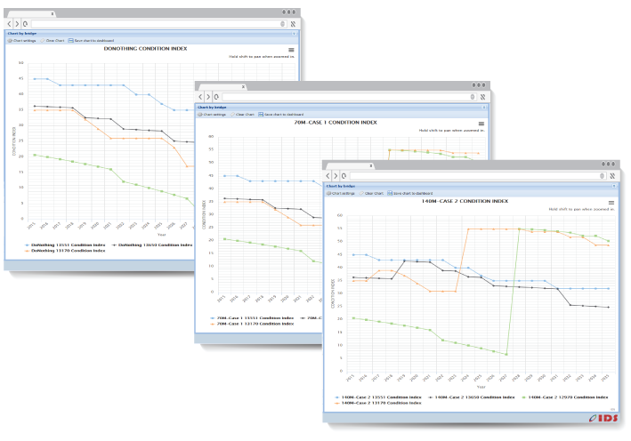 Asset Optimizer™ allows users to investigate a range of planning scenarios, including: (1) scenarios to evaluate the impact of funding levels on system-level condition and risk measures; and (2) scenarios to evaluate funding requirements to achieve desired condition/risk objectives. For each scenario, Asset Optimizer™ generates optimal and feasible project lists, on annual basis. Selected projects satisfy all defined constraints and are guaranteed to be optimal. Asset Optimizer™ also maintains a comprehensive database of intervention methods, and a set of defined constraints and formulae for calculating costs and benefits. Trade-off analysis of various scenarios provides engineers with rich analytics tools (e.g., queries, charting functions, etc.) to quantitatively assess the consequences of various strategies and scenarios on the condition and risk levels of the assets.