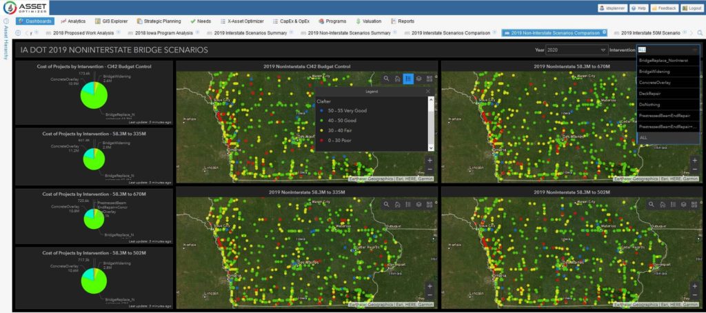Asset OptimizerTM GIS-centered cloud-based software was used to perform in-depth data analysis and develop optimal 20-year risk-based plans for Iowa state-owned bridges. The software implemented a unique risk model, developed by Iowa DOT engineers, to assess the priority of bridges based on structural condition and load rating, as well as a range of criticality factors, e.g., vertical and horizontal clearances, traffic levels, type of carried roadway, detour length, and waterway adequacy. Data-driven deterioration and risk models were developed based on historical NBI data and considered a range of variables such as age, traffic volume, design load, and deck type, etc. Cost and benefits models for various bridge improvement actions were defined, along with various constraints governing these actions.