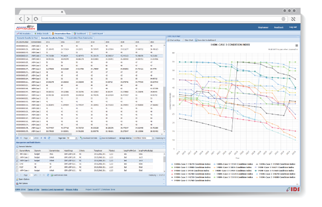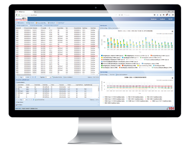 Bridge Optimizer™ allows users to investigate and compare any number of planning scenarios, including: (1) scenarios to evaluate the impact of funding levels on system-level condition and risk measures; and (2) scenarios to evaluate funding requirements to achieve desired condition/risk objectives. For each defined scenario, Bridge Optimizer™ generates optimal and feasible project lists, on annual basis. Selected projects satisfy all defined constraints and are guaranteed to be optimal. Trade-off analysis of various scenarios will provide bridge engineers with rich analytics tools (e.g., queries, charting functions, etc.) to quantitatively assess the consequences of various policies and scenarios on the condition and risk levels of individual bridges, bridge groups, or on the entire inventory. This analysis will help engineers to make rational and evidence-based decisions to determine the most cost-effective long-term system-level preservation plan.